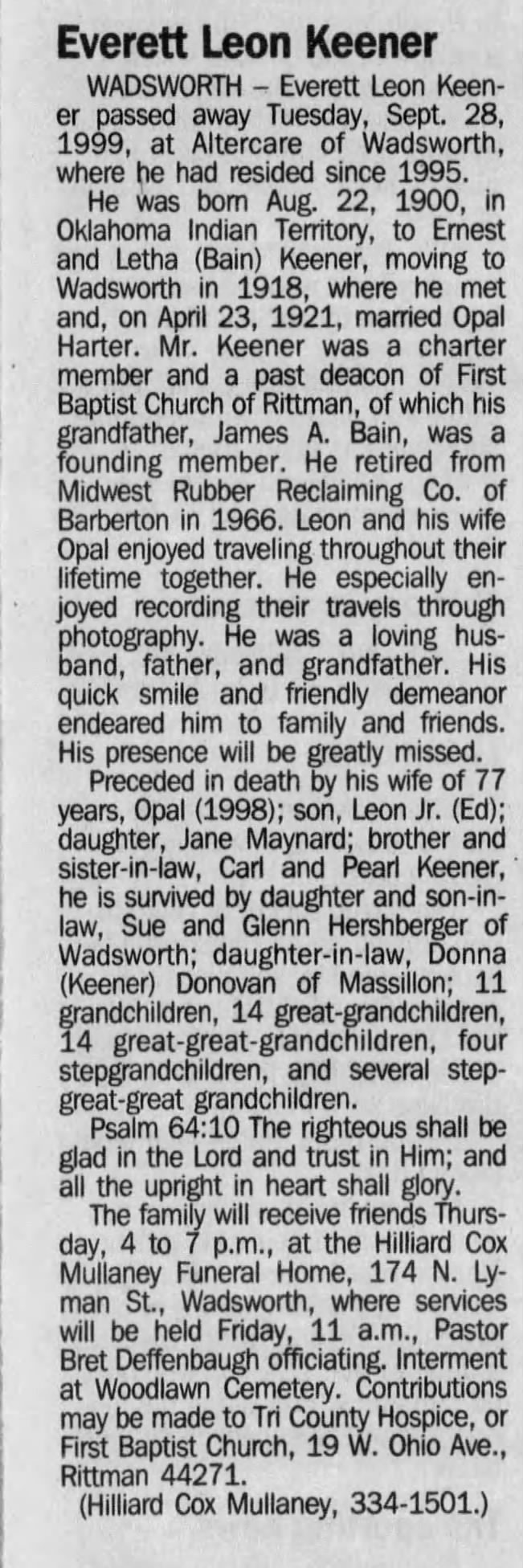 Everett Leon KeenerResidenceSep 28, 1999Wadsworth, Medina, Ohio, United States (Altercare) [S109]