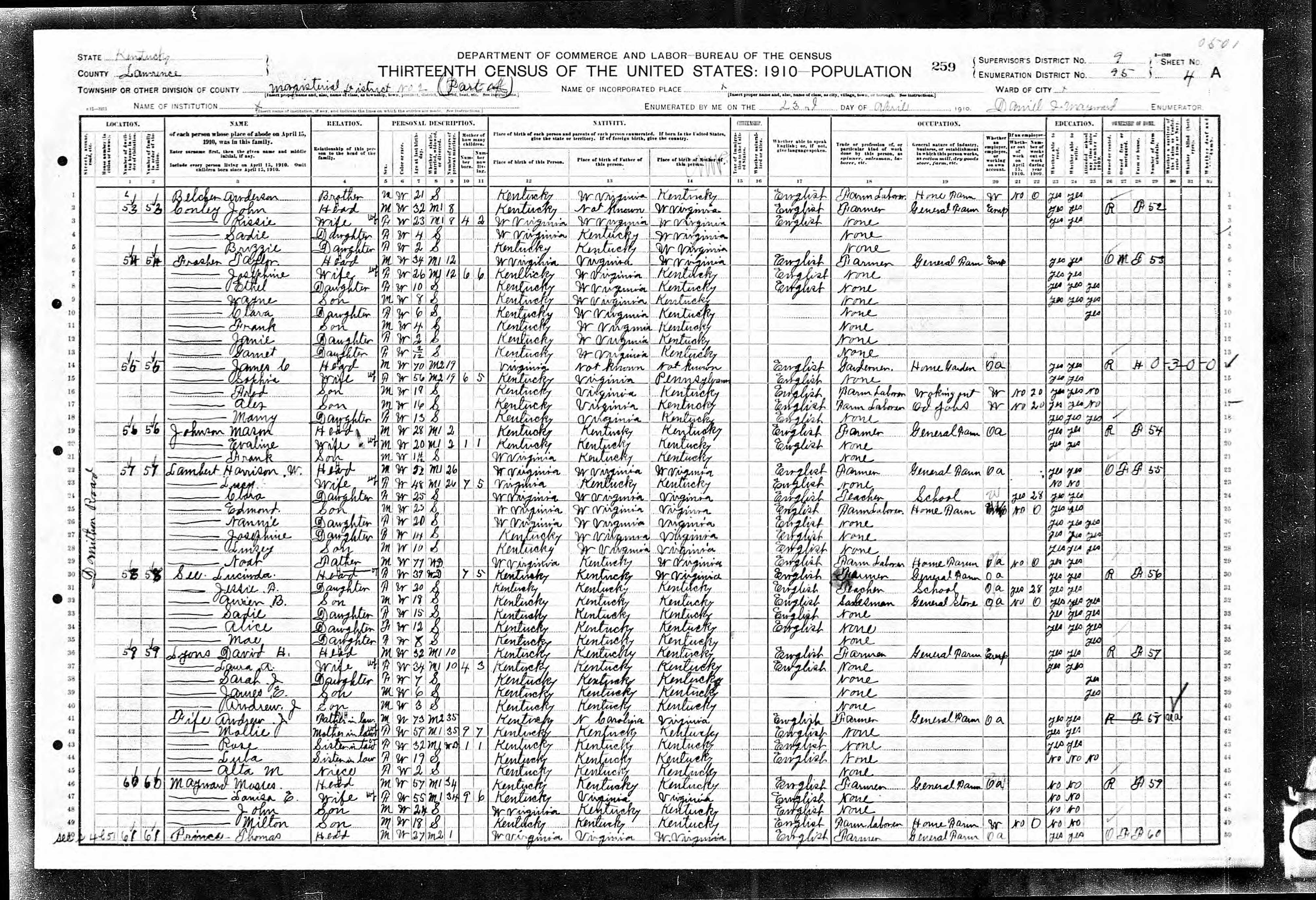 1910 USA census, District 2, Lawrence, Kentucky, Donithon Road, Near Louisa, Lawrence, Kentucky,…