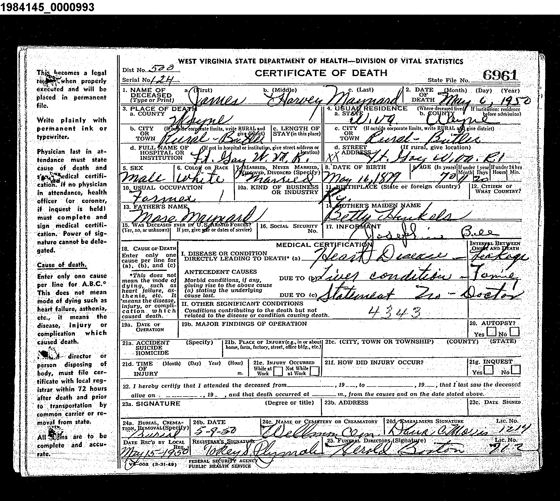 • "Death certificate of James Harvey Maynard, May 9, 1950".