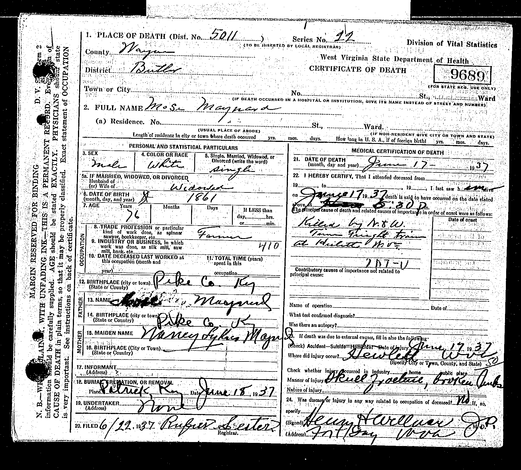 Death__United States of America__West Virginia__Wayne County-17 Jun 1937-Moses Maynard-(Certificate 9689), June 17, 1937