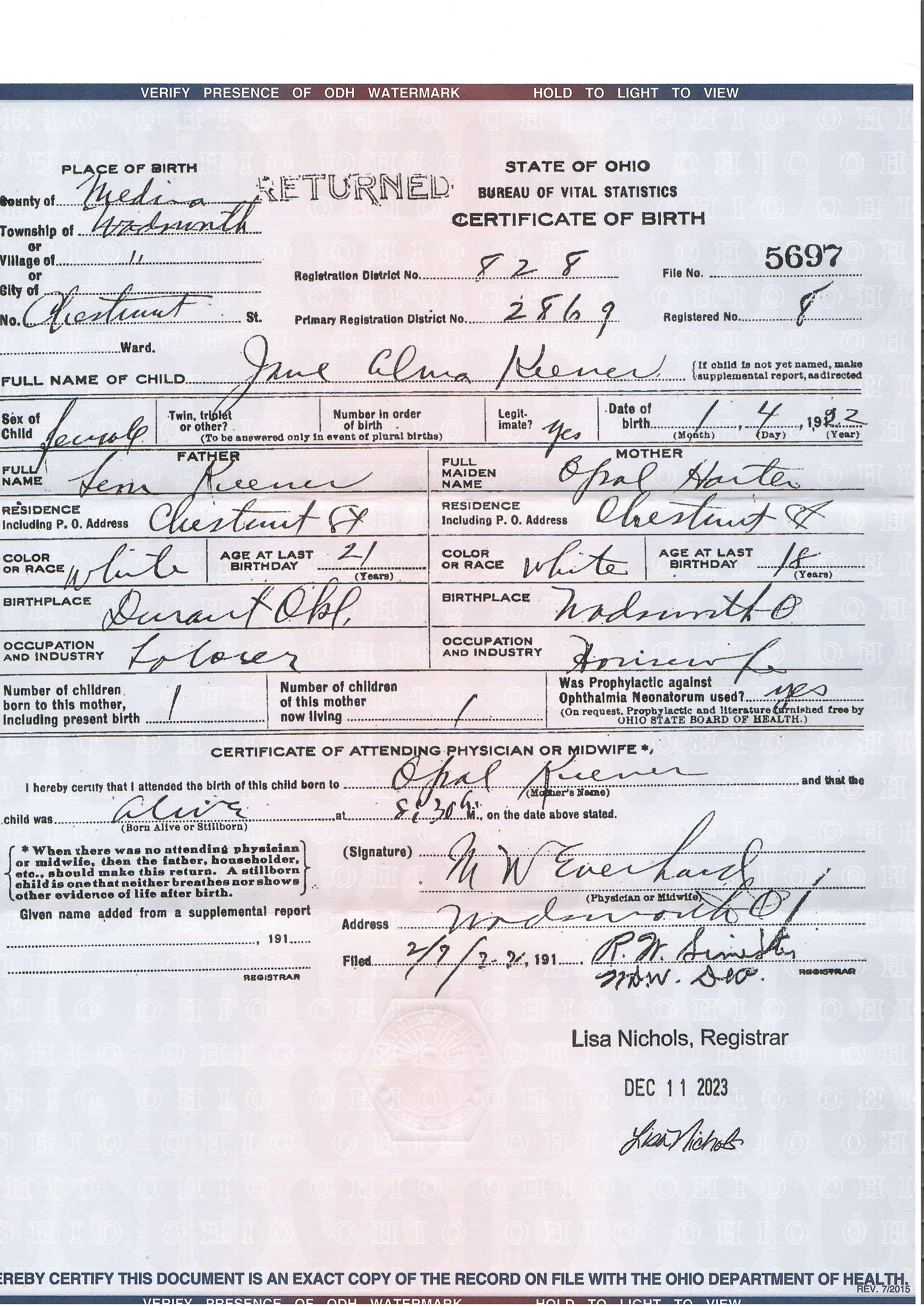 Marion Opal HarterBirthcal 1903Wadsworth, Medina, Ohio, United States [S107]